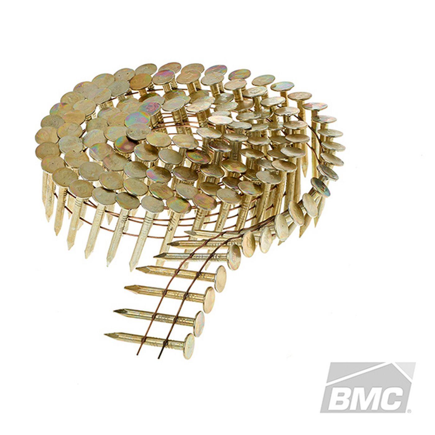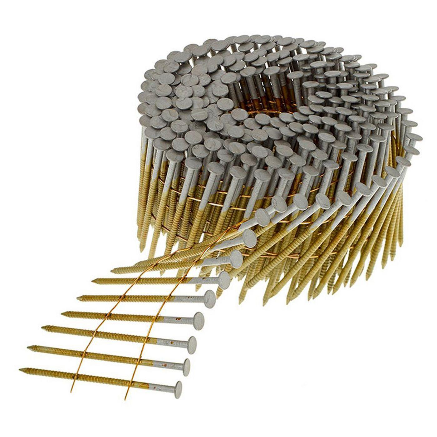 Meeting the industry standard for coil roofing nails these fasteners are made with a 3 8 diameter head 120 11 gauge shank diameter and are collated at a 15 degree angle.